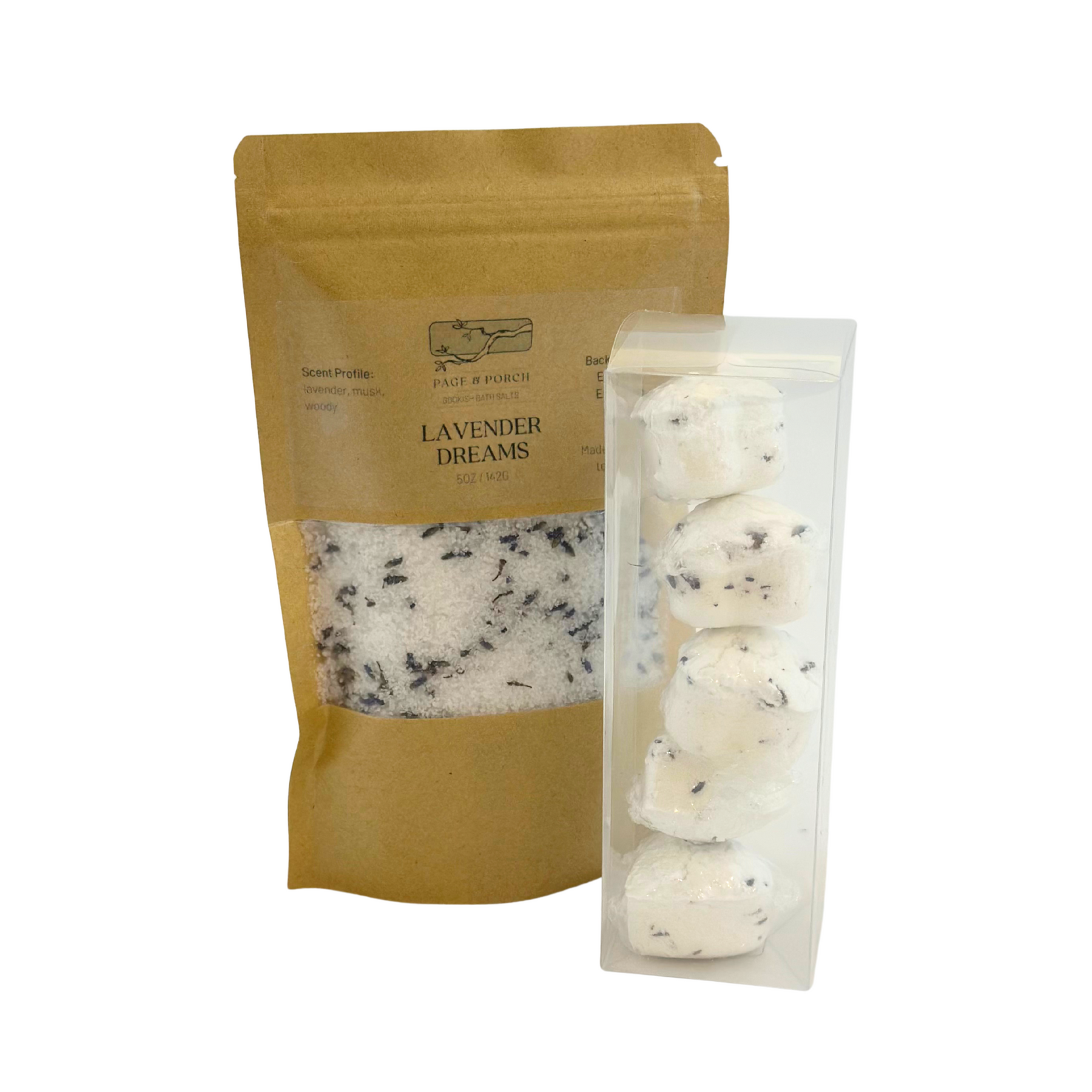 Packaged lavender dreams bath salts and shower steamers with a brown bag and clear container on a white background